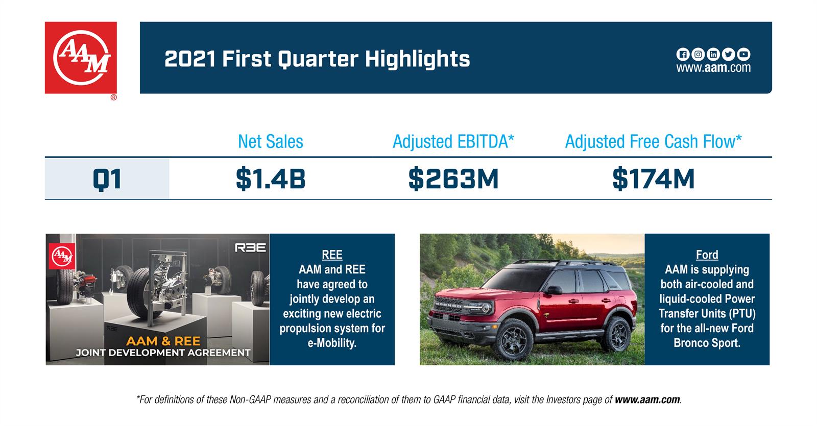 “In the first quarter of 2021, AAM delivered solid operating performance and cash flow generation,” said AAM’s Chairman and Chief Executive Officer, David C. Dauch. “Although the industry is facing continuity of supply issues, we continue to navigate through these challenges while delivering strong results. In addition to driving operational excellence and managing our cost structure, we continue to make strategic investments and establish technical partnerships to support the industry shift towards electrification.”